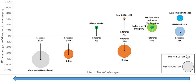 Die Forscher des Fraunhofer IEE haben zudem herausgefunden, dass eine Versorgung mit Wärmepumpen die Nachfrage nach Wasserstoff um 150 bis 400 Terrawattstunden jährlich entlastet. Sie kommen zu dem Schluss, dass Wasserstoff für die Gebäudewärmeversorgung hinsichtlich Effizienz und Infrastrukturanforderungen am schlechtesten abschneidet.
